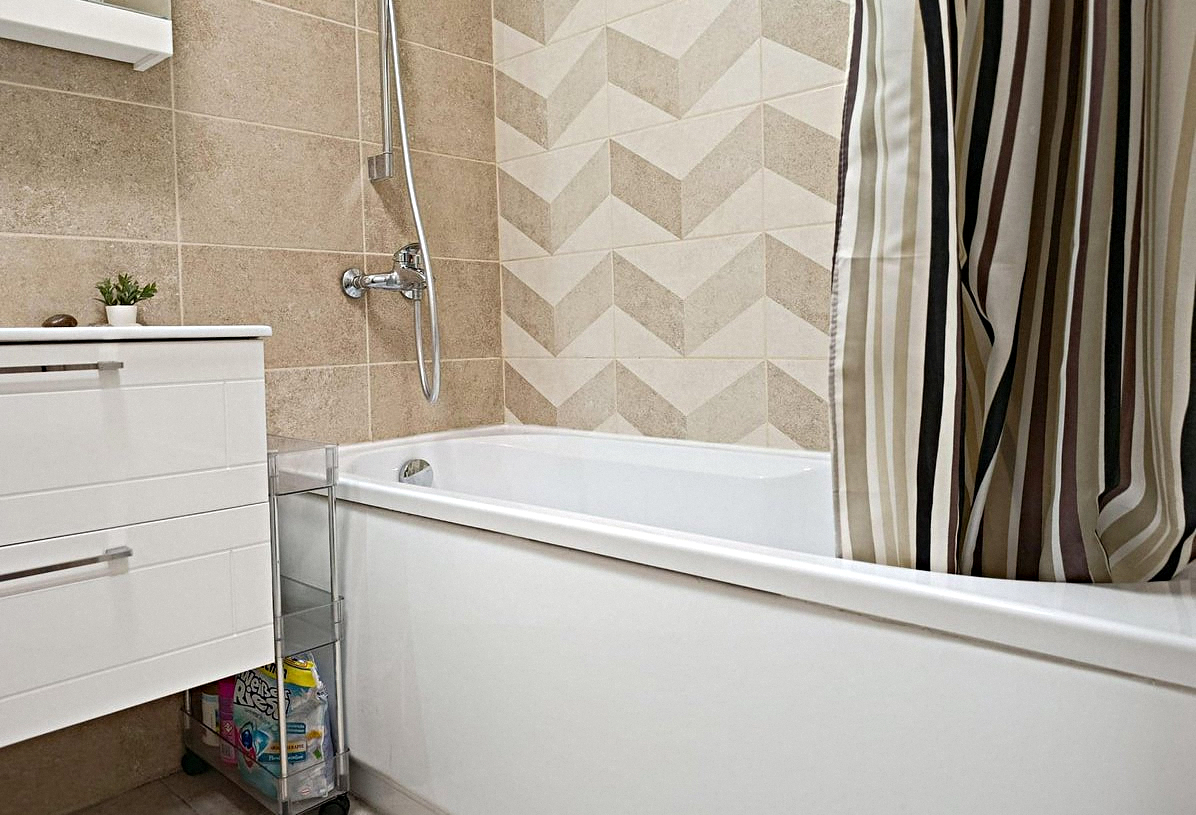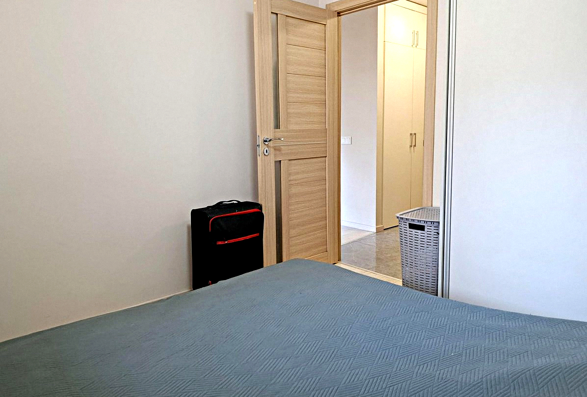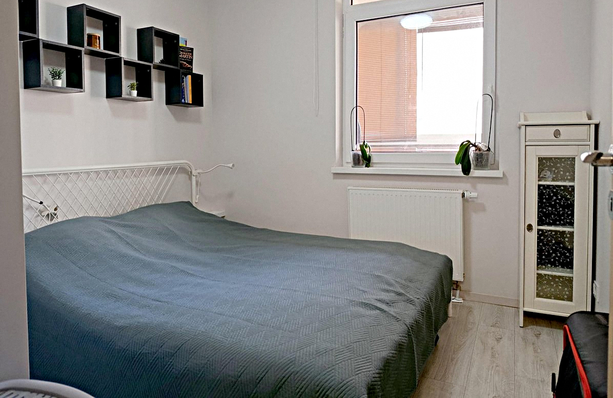 The kitchen is combined with the living room: This stylish room features all the necessary appliances, kitchen utensils, a dining table, air conditioning, a fold-out double sofa bed, and a Smart TV.