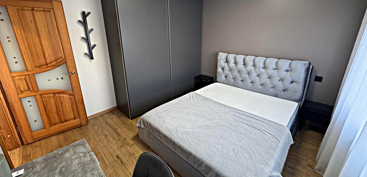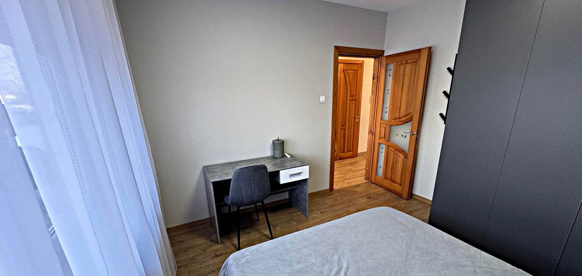 Bedroom: Cozy room with a double bed, wardrobe, and desk.