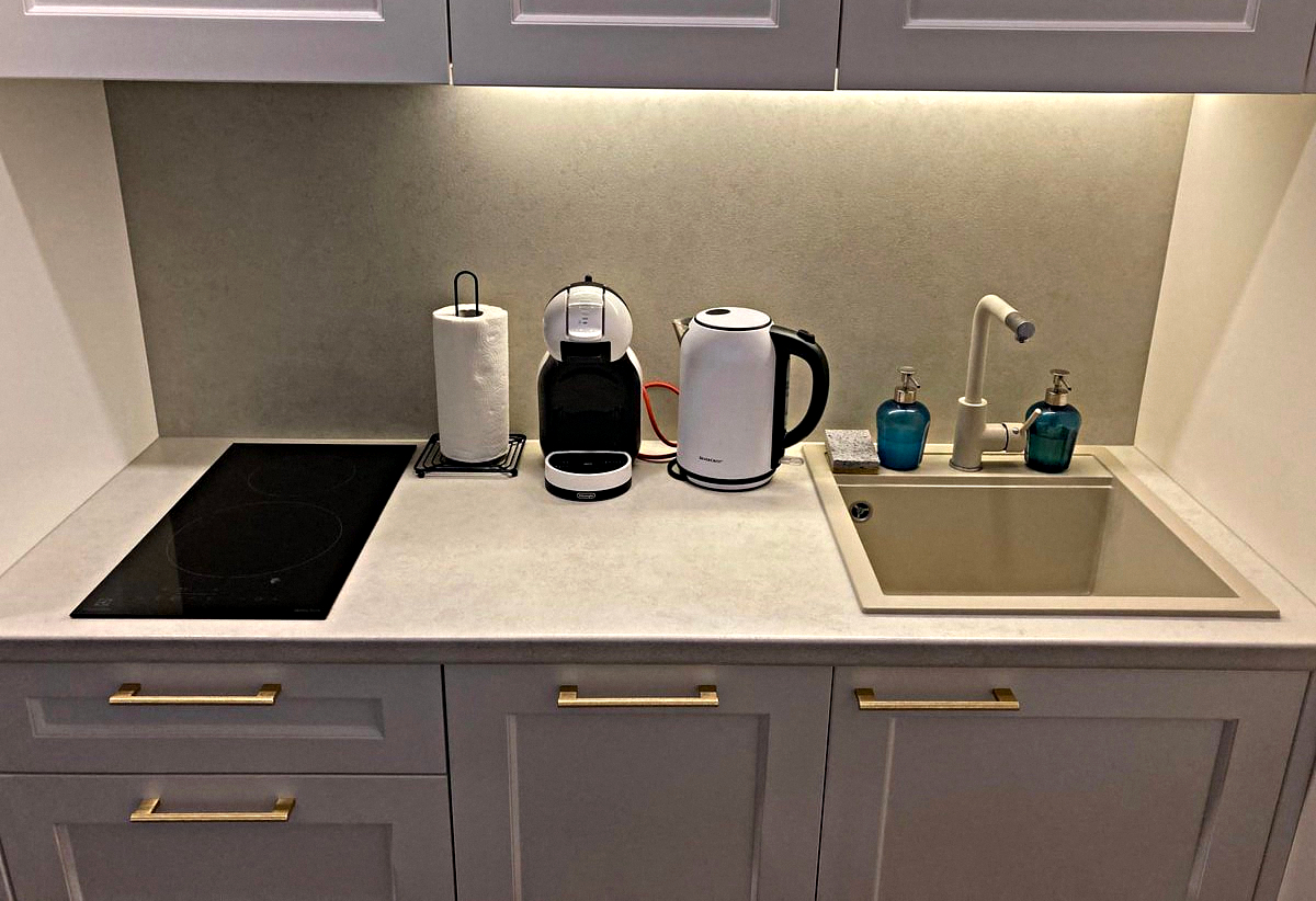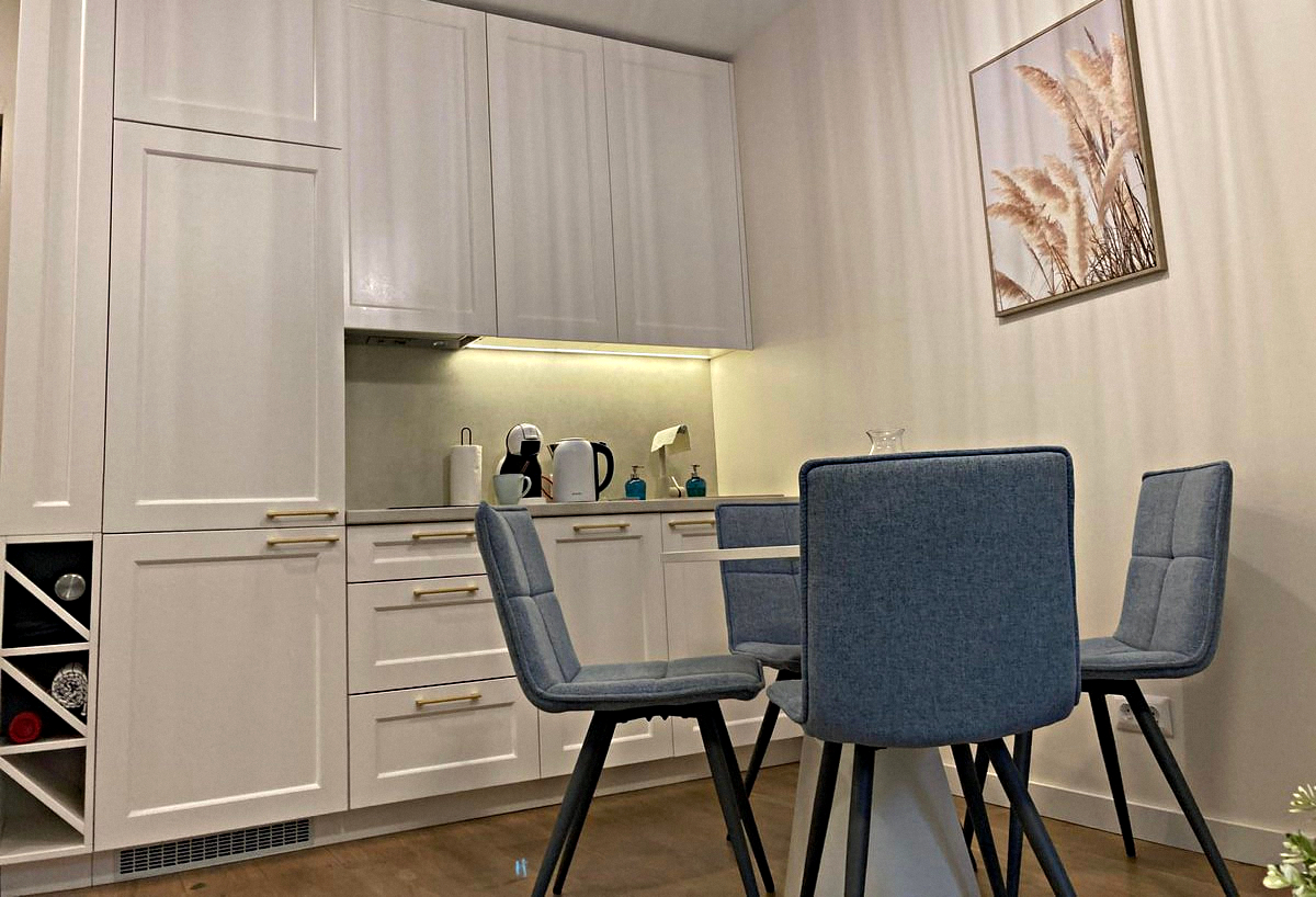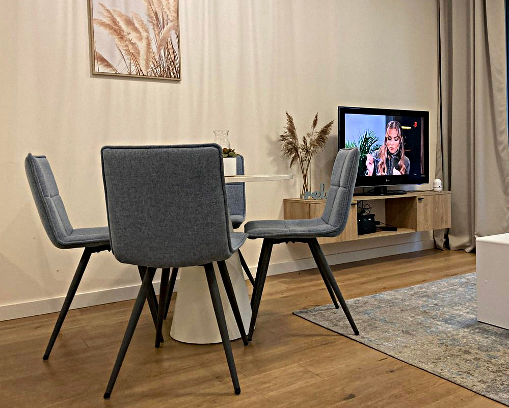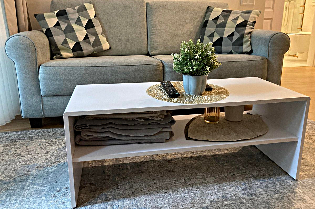 KitchenLiving Room: Sunny room with all necessary appliances, kitchen utensils, dining table, sofa, and Smart TV.