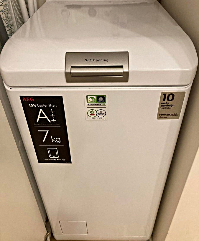 Bathroom: Shower stall, sink with mirror, washing machine, and toilet.