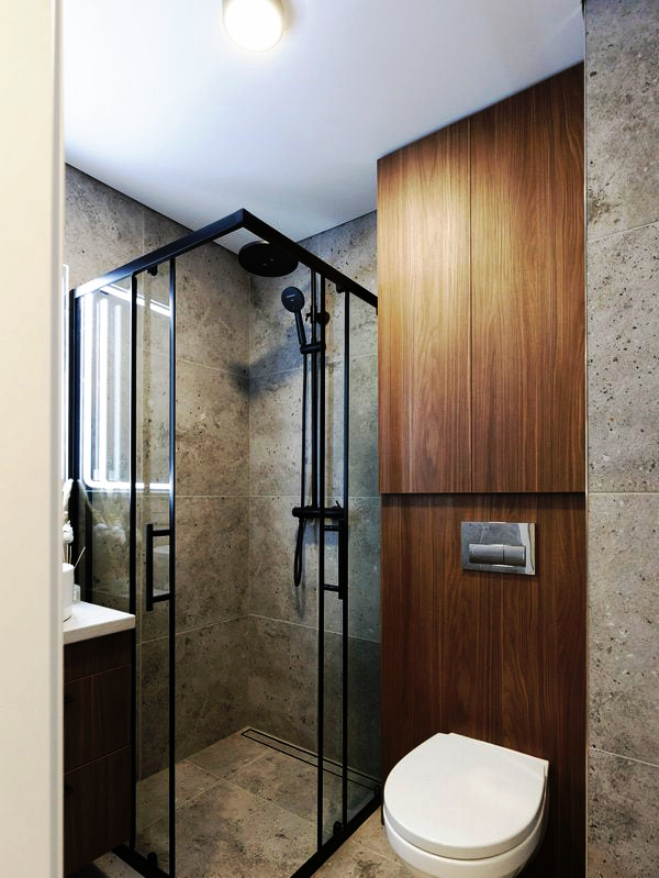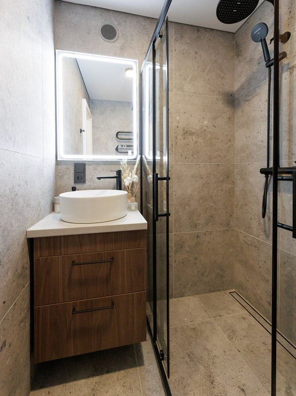 Bathroom: Shower stall, sink with mirror, and toilet.