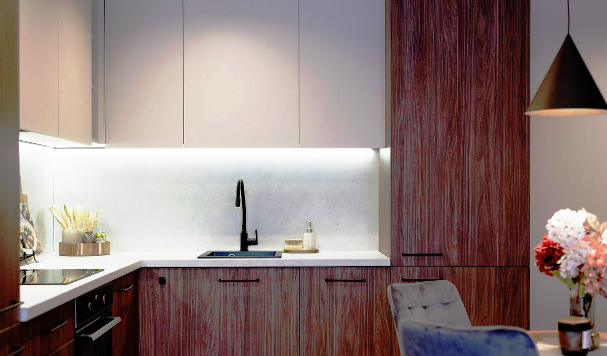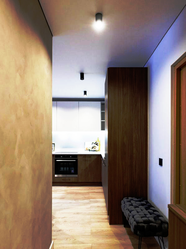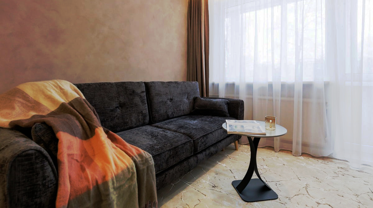 Living room combined with kitchen: Spacious room with all necessary appliances, kitchen utensils, a small fold-out sofa, and a dining table.