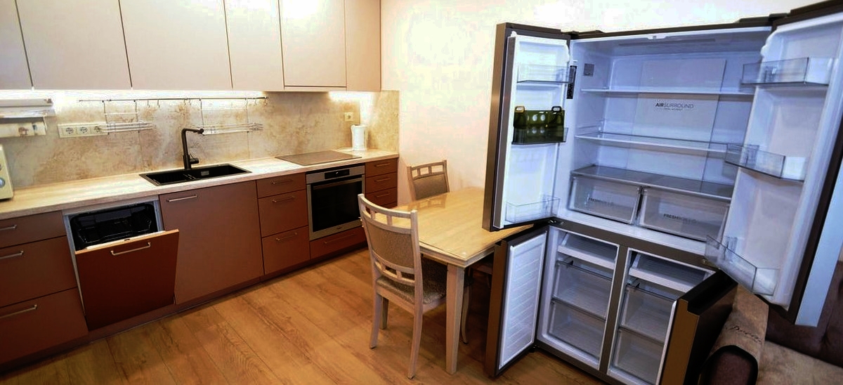 Living room & Kitchen: A sunny, open-plan space. It comes with all the necessary appliances, kitchenware, a dining table, a small pull-out sofa, air conditioning, and a Smart TV.