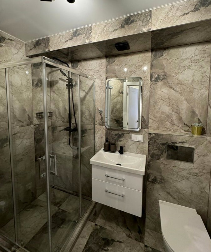 Bathroom: Shower stall, sink with mirror, and toilet.