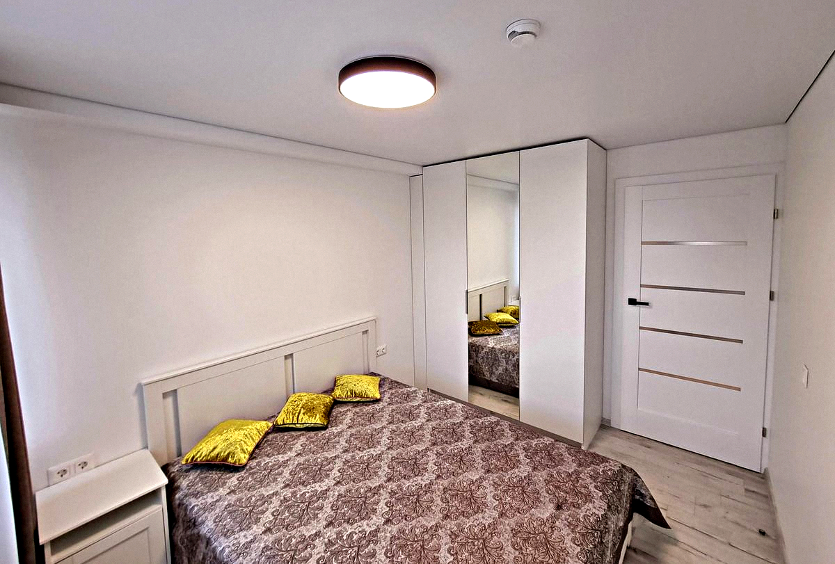 Bedroom: A comfortable room with a double bed and a wardrobe with a mirror.